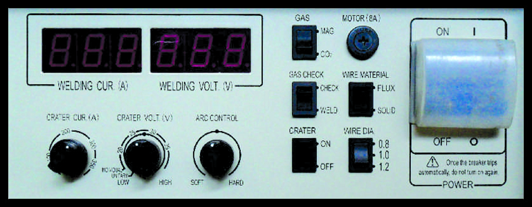 Painel simples de operar: - Diâmetro do arame - Arame sólido/ tubular - Gás mistura/ CO2 - Função cratera (2/4 tempos) - Ajuste do arco - Display de voltagem e amperagem